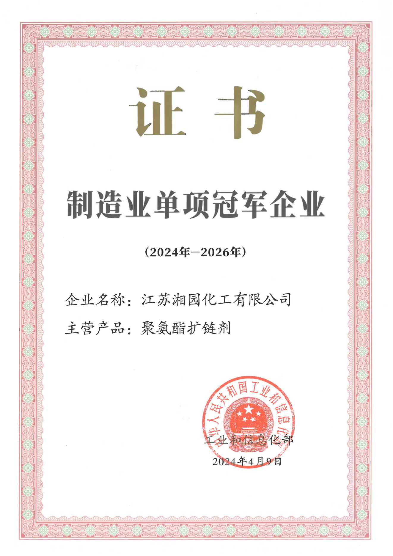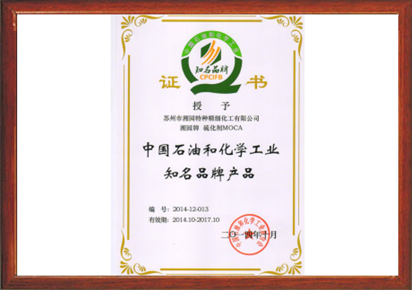 “湘園牌”聚氨酯橡膠硫化劑MOCA被授予中國(guó)石油和化學(xué)工業(yè)聯(lián)合會(huì)知名品牌產(chǎn)品