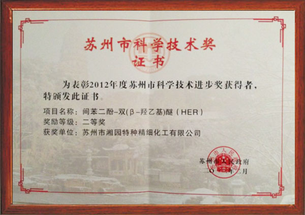 間苯二酚-雙(β-羥乙基)醚(HER)獲評(píng)為2012年度蘇州市科學(xué)技術(shù)進(jìn)步獎(jiǎng)
