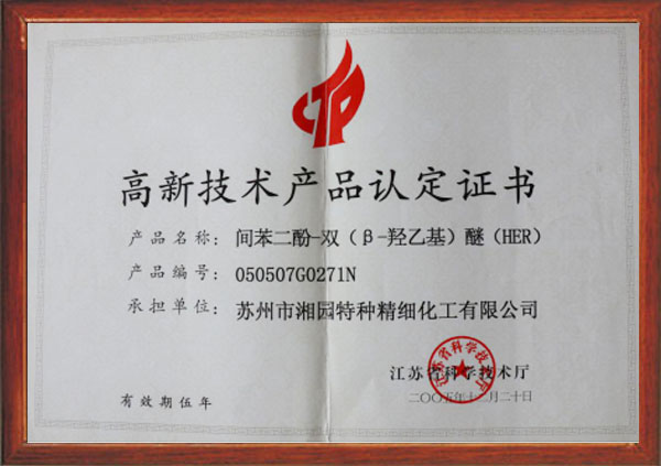 間苯二酚-雙(β-羥乙基)醚(HER)被認(rèn)定為江蘇省高新技術(shù)產(chǎn)品