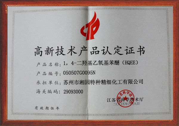 1,4-二羥基乙氧基苯醚(HQEE)被認(rèn)定為江蘇省高新技術(shù)產(chǎn)品