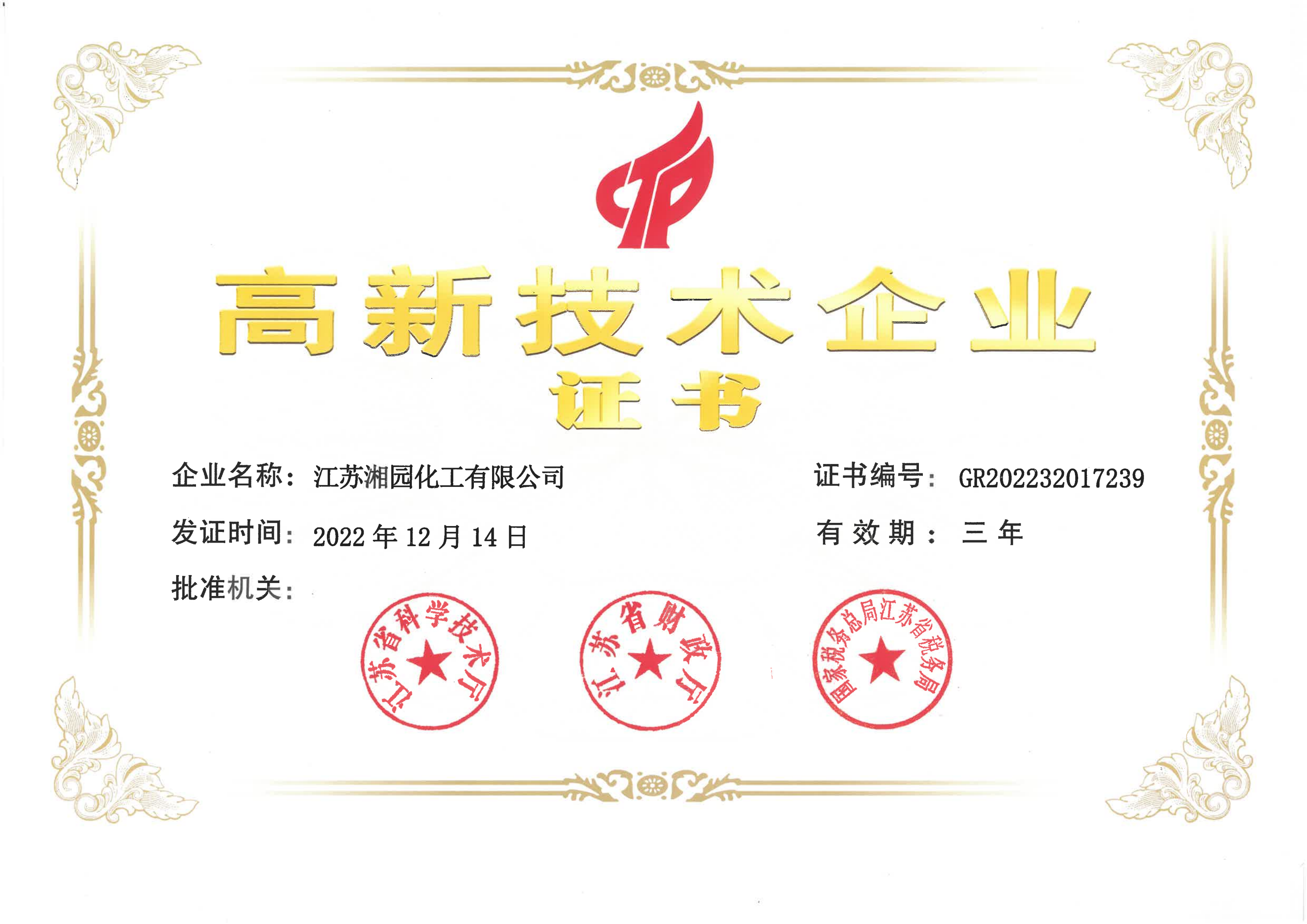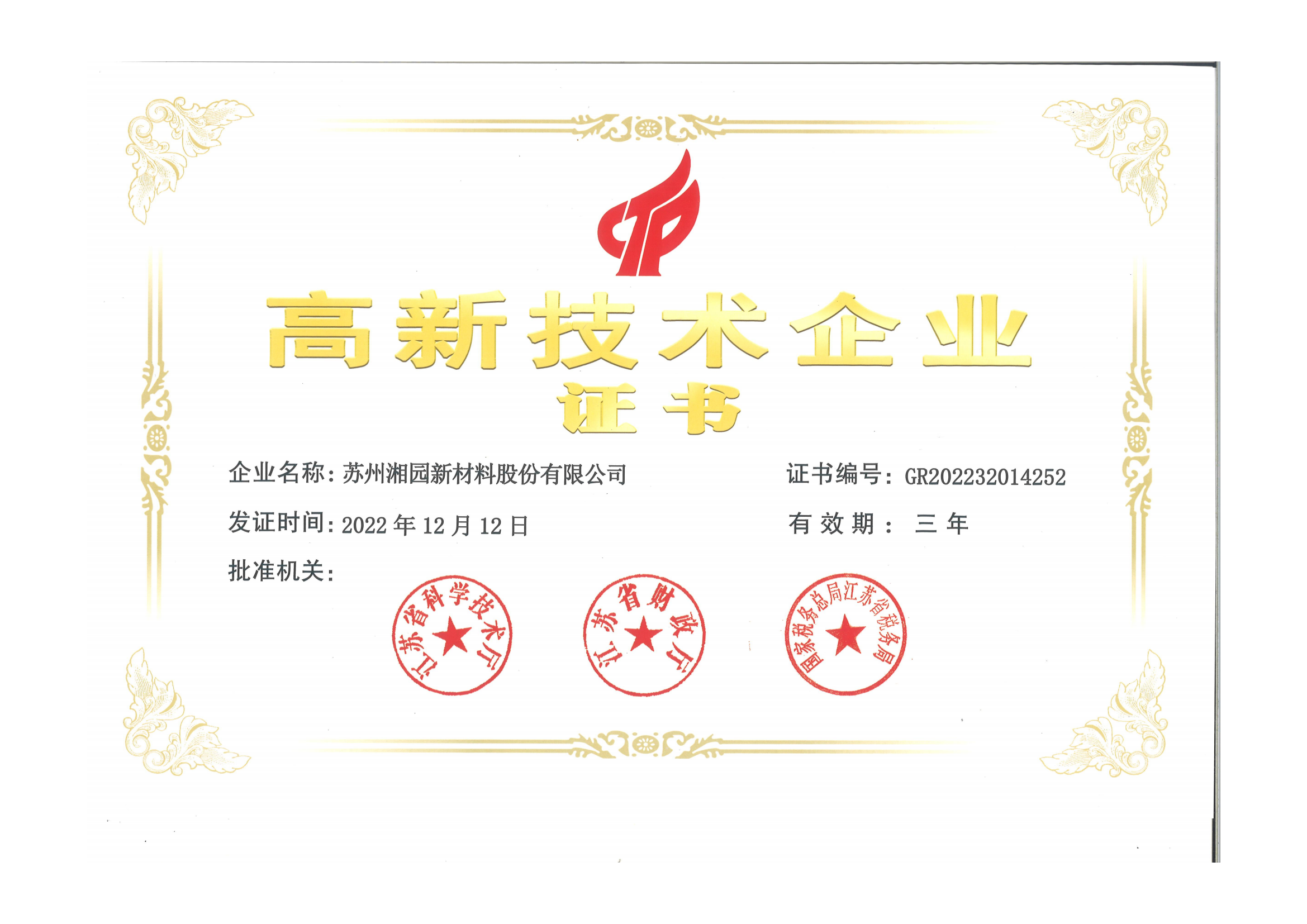 連續(xù)獲評(píng)為高新技術(shù)企業(yè)(江蘇湘園)